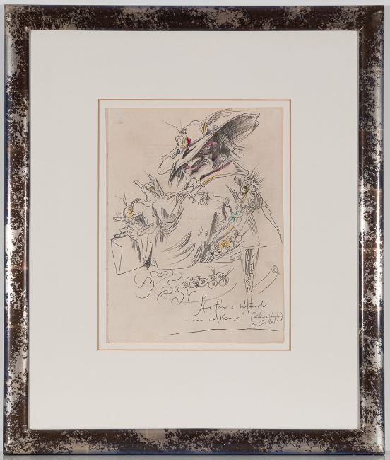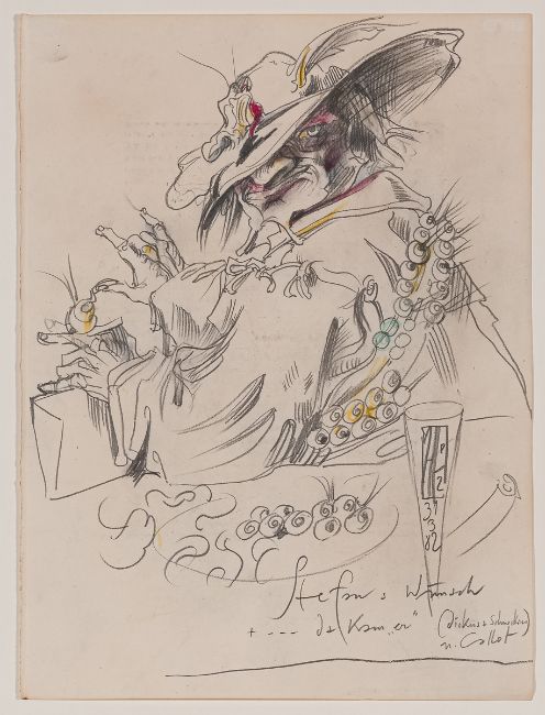 1929 Hamburg - 1995 Hamburg - "Der Schneckenmann" (nach Callot) - (1982) Blei- und Farbstifte/Papier. 34,4 x 25,7 cm. Monogr. und dat. r. u.: HJ 31 / 3 / (19)82. Bez. r. u.: Stefans Wunsch / (...) / (dickuss + Schnecken) / n. Callot. Rückseitig auf Etikett der Galerie Depelmann, Langenhagen bez. und betit. Passepartout. Voll ansichtig unter Glas gerahmt. - Provenienz: Privatbesitz Norddeutschland, zuvor erworben bei der Galerie Depelmann, Langenhagen.