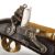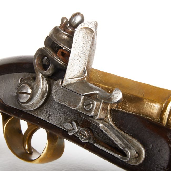 wohl Italien, 19. Jahrhundert. Messing, Holz. Runder und schwerer, nach Baluster konisch erweiterter Lauf aus Messing. Glattes eisernes Steinschloss. Der dunkle Holzschaft mit glatter Messinggarnitur. Eiserner Ladestock. Länge 31 cm. Beigabe: Pulverhorn. Spuren v. Alter.