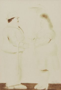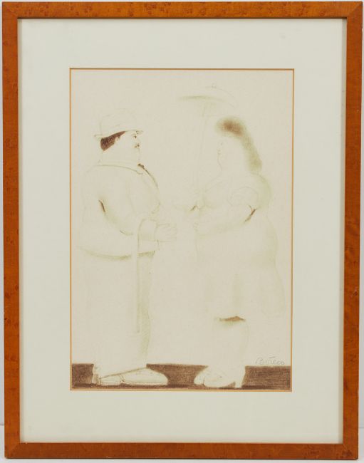 1932 Medellín - 2023 Monaco - Mann und Frau - Lichtdruck/Papier. 31,7 x 22 cm (Passepartoutausschnitt). Mit Bleistift sign. r. u.: Botero. Passepartout. Unter Glas gerahmt. Ungeöffnet. Etwas verblichen. - Beigegeben: Brusberg Dokumente 11. Fernando Botero. Das plastische Werk. 44/1111. Hannover 1978 (Impressum herausgetrennt und auf der Rahmenrückseite des gerahmten Lichtdruckes befestigt). Das handsignierte Blatt entstammt dem 1978 herausgegebenen Werkverzeichnis der plastischen Arbeiten. Botero ist einer der bekanntesten Maler Lateinamerikas, er stammt aus Kolumbien. 1951 zog er nach Bogotá und kurz darauf nach Europa. Er studiert in Madrid an der Academia San Fernando und dem Prado-Museum und ab 1953 in Florenz Kunstgeschichte. 1960 zieht er nach New York und 1973 nach Paris und beginnt plastisch zu arbeiten. Seine Arbeiten sind in internationalen Sammlungen vertreten.