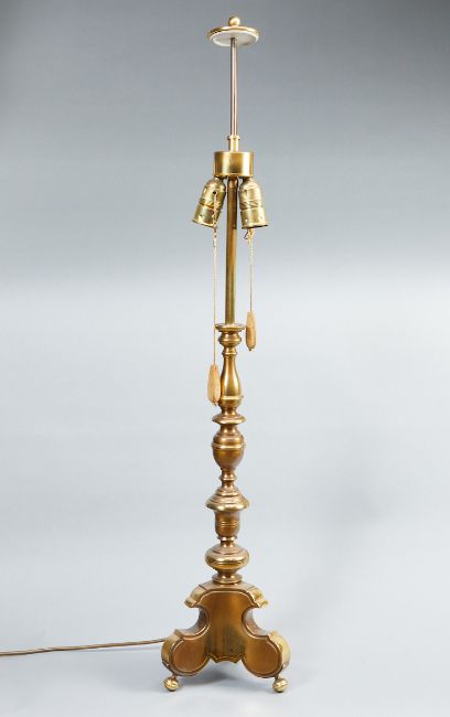 20. Jahrhundert. Messing, H. 105 cm. Dreibeiniger Lampensockel aus Messing mit Baluster-Schaft, zwei Lampenfassungen, ohne Lampenschirm. Spuren v. Alter u. Gebrauch.